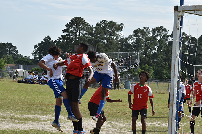 The East Hoke Middle School boys’ soccer team is heading to the Southeastern Conference Middle School Championship following their victory over Hamlet on Monday. The final score was 6-0. East Hoke remains undefeated this season, and the Eagles’ goalie, Marcus Monsanto, has yet to allow a goal all season. Top Left: Giovanni Patterson takes a shot from inside the penalty box that just sails over the crossbar. Bottom Left: Duglas Cruz Mejia enjoys a breakaway late in the game moments before scoring a goal. Right: East Hoke boys coach Jasmyn Riggins rallies the team at halftime.