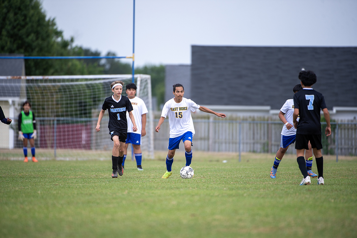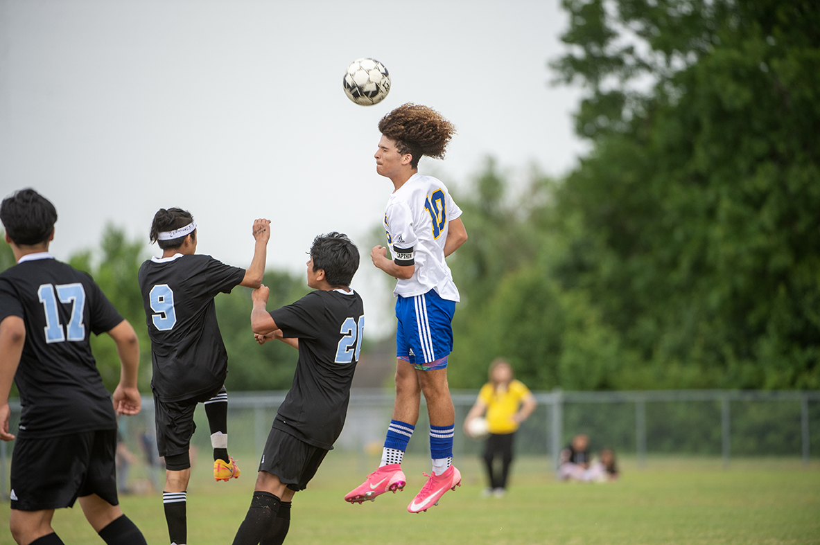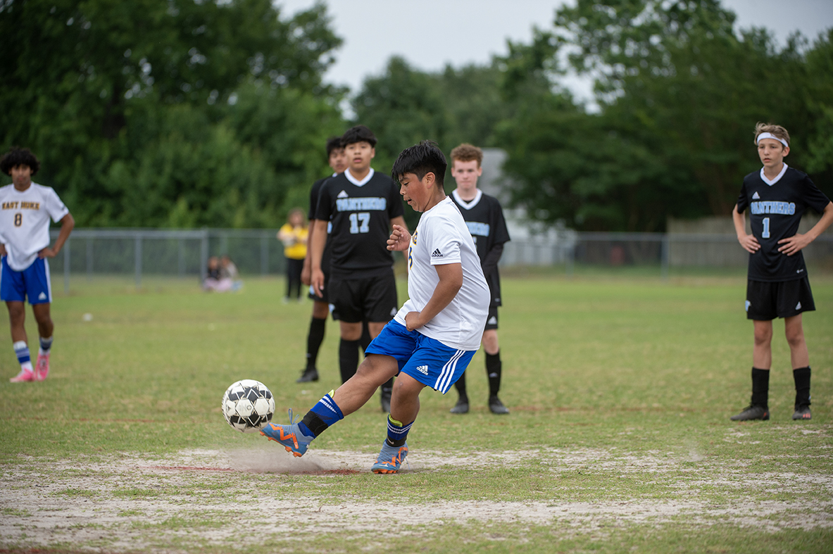 East Hoke defeated Sandy Grove 3-0 during the SEC Middle school boys soccer Championship at East Hoke Middle school in Raeford on May 18, 2023. Top left, East Hoke’s Diego Tirado Martinez scores on a PK against Shady Grove. Top right, East Hoke’s Giovanni Patterson heads the ball against Shady Grove during the SEC Middle school boys soccer Championship at East Hoke Middle school. Bottom left, East Hoke’s Andres Gomez Sosa looks up field for the open pass against Sandy Grove. Bottom right, East Hoke’s Douglas Cruz Mejia takes a shot on goal against Shady Grove.